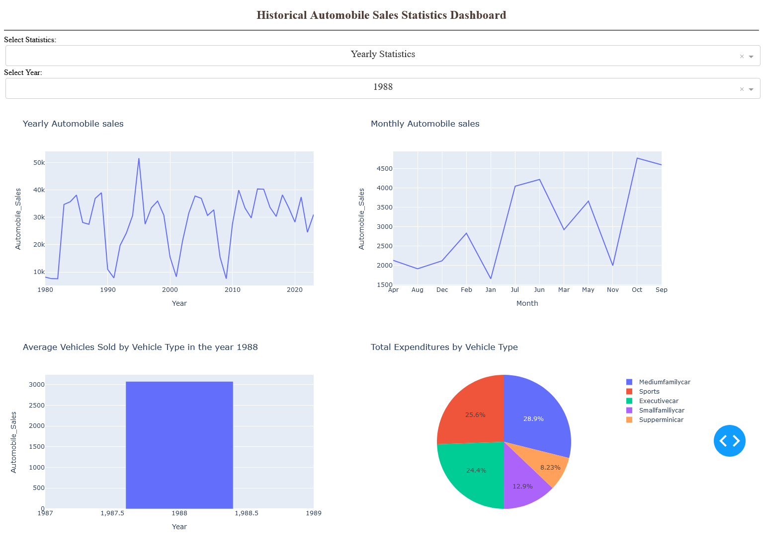The Historical Automobile Sales Statistics Dashboard is a web-based tool created as part of the IBM Data Analyst Certification project. It allows users to visualize and analyze data related to automobile sales, advertising expenditure, and more.